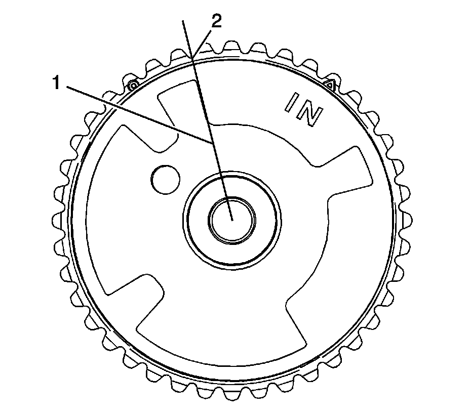 3. On the right intake camshaft actuator the edge of the reluctor wheel (1) lines up with the valley (2) of the sprocket tooth.