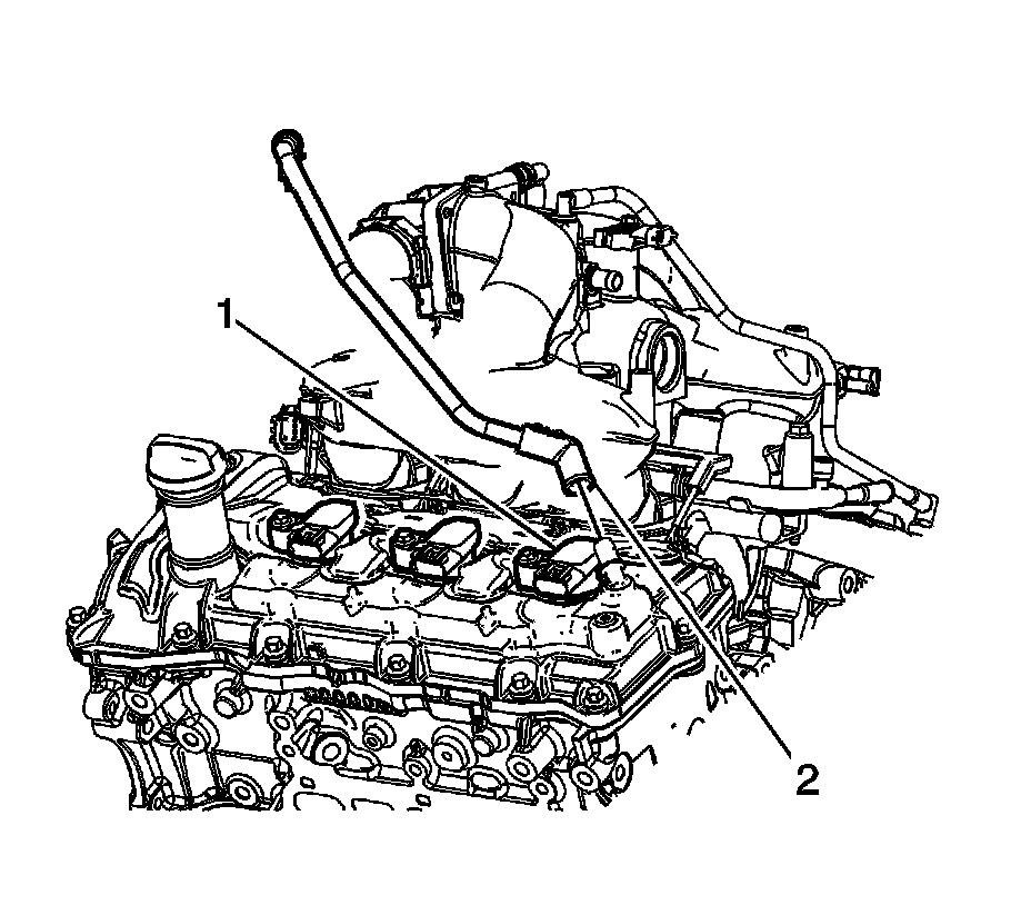 3. If the number 6 ignition coil (1) was removed, connect the PCV fresh air line (2) to the camshaft cover.