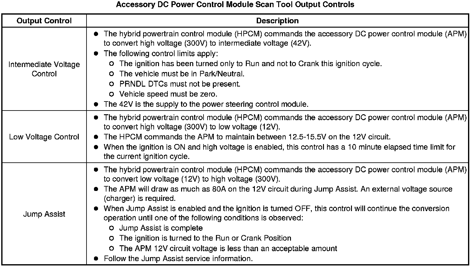The Accessory DC Power Control Module Scan Tool Data Parameters list contains hybrid controls-related parameters. The list is arranged in alphabetical order.