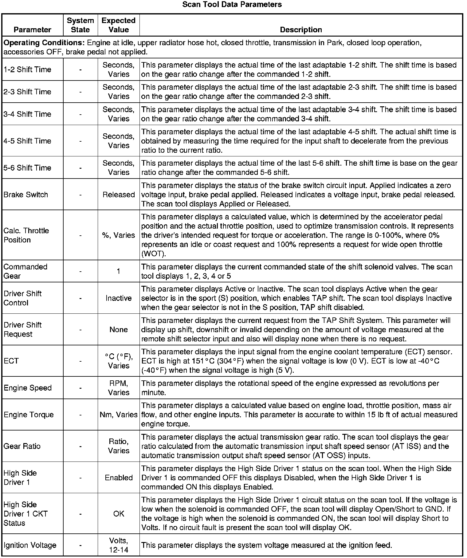 The Transmission Control Module Scan Tool Data List contains all transmission related parameters that are available on the scan tool. The list is arranged in alphabetical order. A given parameter may appear in any one of the data lists, and in some cases may appear more than once, or in more than one data list in order to group certain related parameters together.