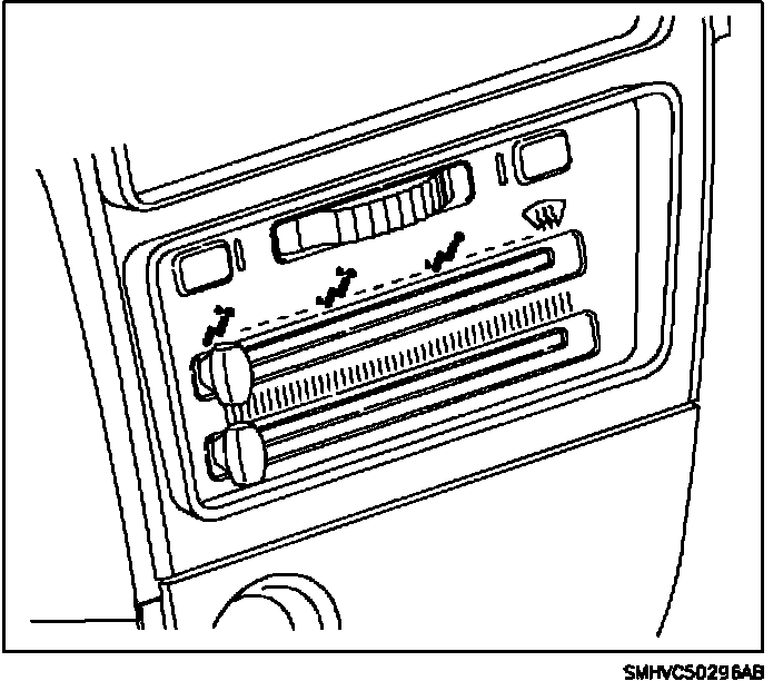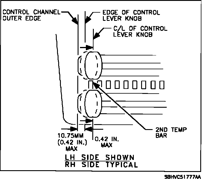 a. Move mode lever to the full vent position and the temperature lever to the full cold position. Hold the cables about two seconds, then release. The centerline of the lever knobs should not be past the centerline of the second temperature bar, as shown in the illustration.