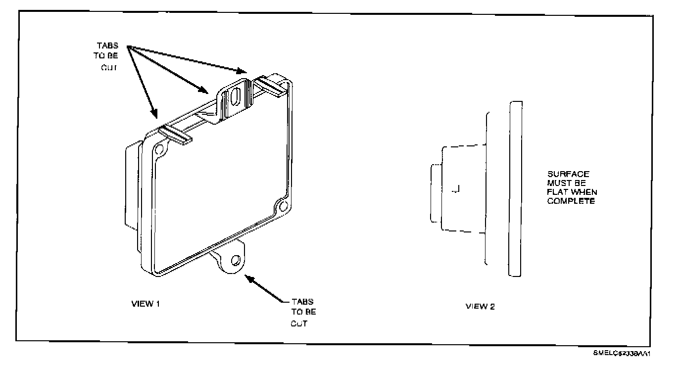 When replacing a headlamp control module, use a hacksaw blade to cut plastic mounting tabs off of replacement headlamp control module. Refer to illustration for tabs to be cut off.
