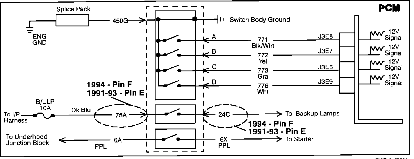 The transaxle gear selector switch contains four switches that ground four different circuits. These circuits are 771 (switch A), 772 (switch B), 775 (switch C), and 776 (switch D). (The transaxle gear selector switch also contains the backup lamp switch and the neutral/start switch.)