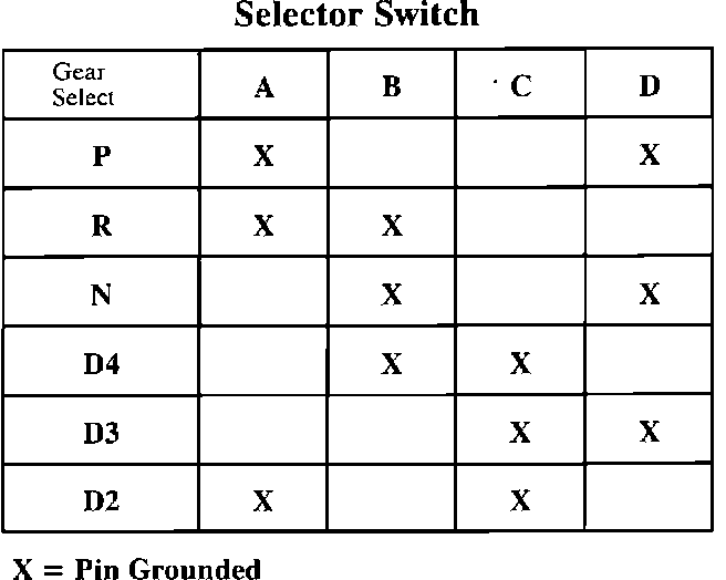 The transaxle monitors these four circuits and determines what gear the operator has selected by the combinations of opens and grounds. Each combination indicates a specific selection in the manual shift quadrant (PRND32).