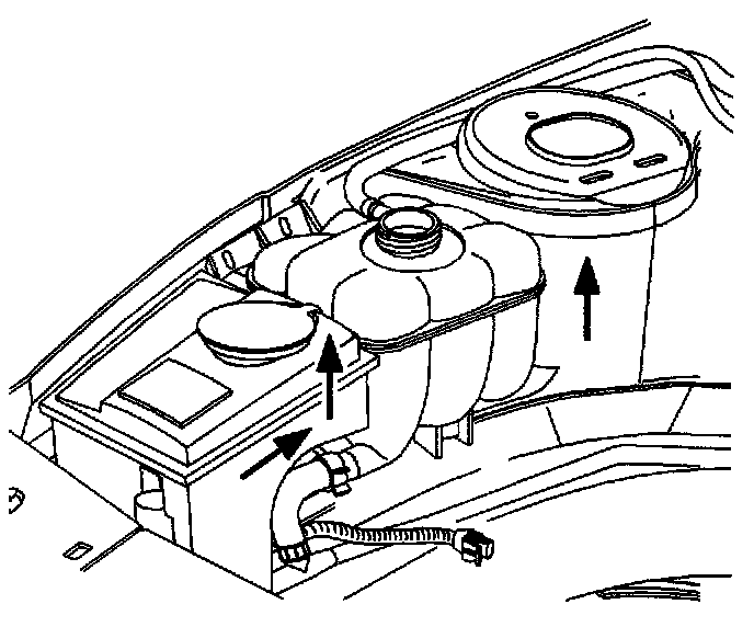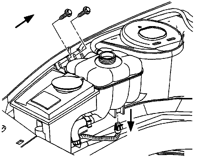 17. Install washer and coolant bottles. Tighten the bolts to the washer/coolant bottles and install heater return pipe in hold down clips.
