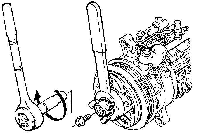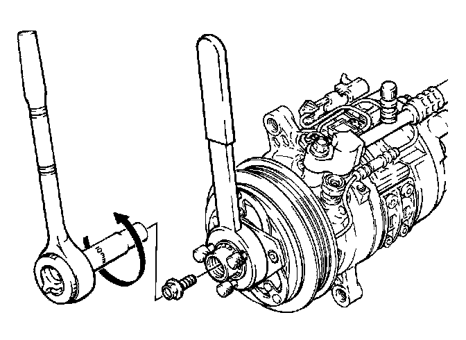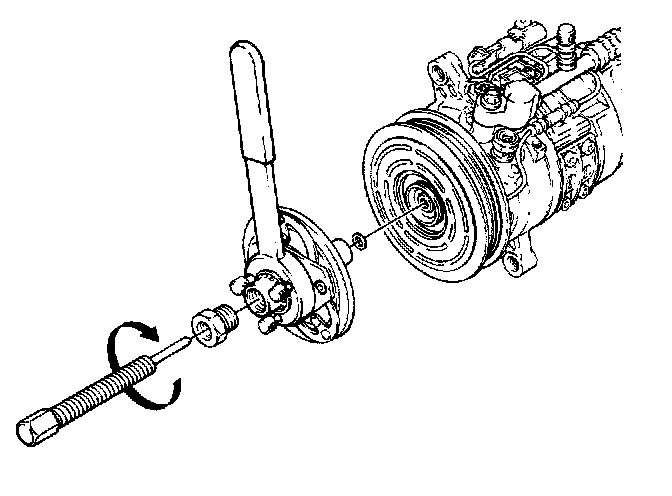 12. While holding the end of the installation bolt, tighten nut to press drive plate onto compressor shaft. Tighten until drive plate bottoms.