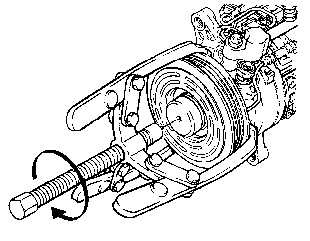 8. Position the puller center SA9149AC-2 on the end of the compressor hub. Install three jaw puller on compressor pulley. Tighten the center bolt to remove pulley assembly.