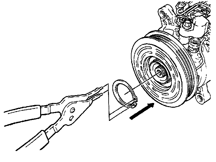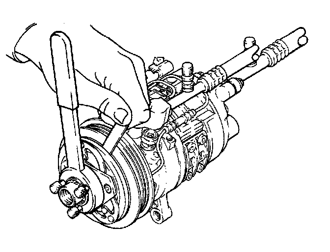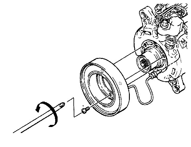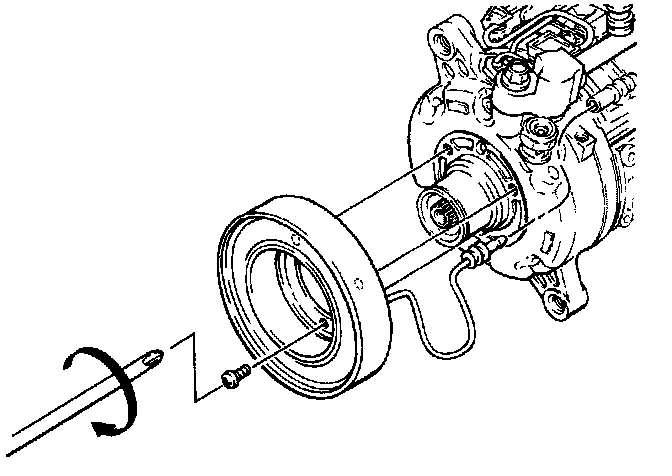 15. Check that the clutch clearance is between 0.3 and 0.6 mm (0.01 and 0.02 in). If necessary, adjust the clearance by using shim(s) provided. Repeat steps 5 and 6 of compressor clutch removal. Then repeat steps 7 through 13 of Compressor Clutch Installation.