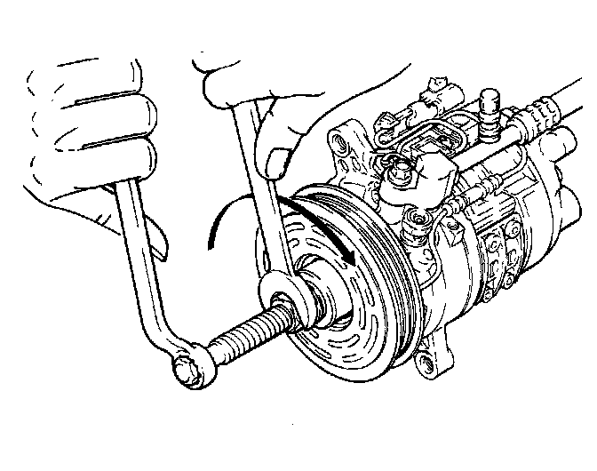 1. Loosen belt tensioner and remove accessory drive belt from compressor clutch pulley.