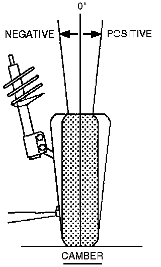 Caster is a measure of the angle between the steering axis and vertical when viewed from the side of the vehicle with the wheel in the straight ahead position. The steering axis is determined by the location of the lower control arm ball joint and the center of the strut-to-body attachment. A line drawn through the center of the ball joint and the strut-to-body joint represents the steering axis. When the center point of the strut-to-body attachment is rearward of the ball joint, the caster is positive. When the center of the strut-to-body attachment is forward of the ball joint, the caster is negative.