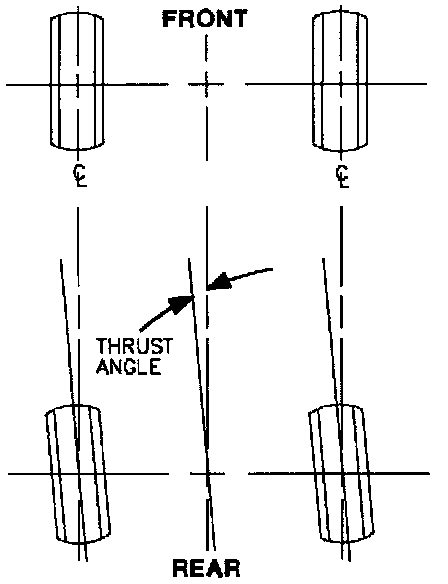 Thrust angle is the angle between the geometric centerline of the vehicle and the direction that the rear wheels track. Ideally, the thrust angle is equal to zero.