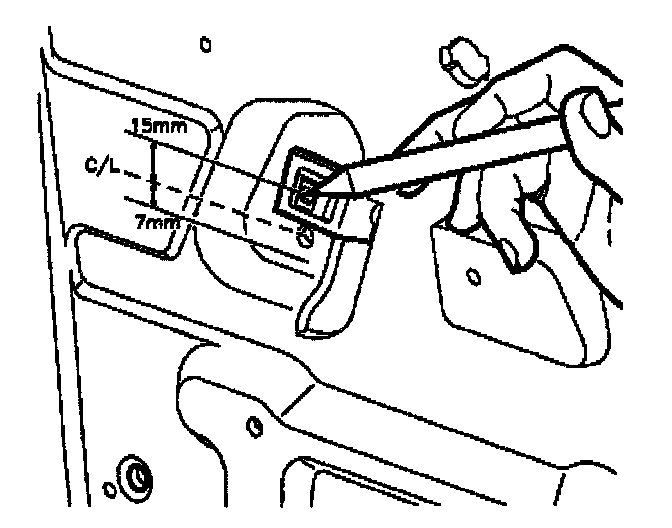 7. On the inside of the inner door panel, mark a horizontal line 15 mm (0.60 in.) above and 7 mm (0.28 in.) below existing hole in inner door panel.