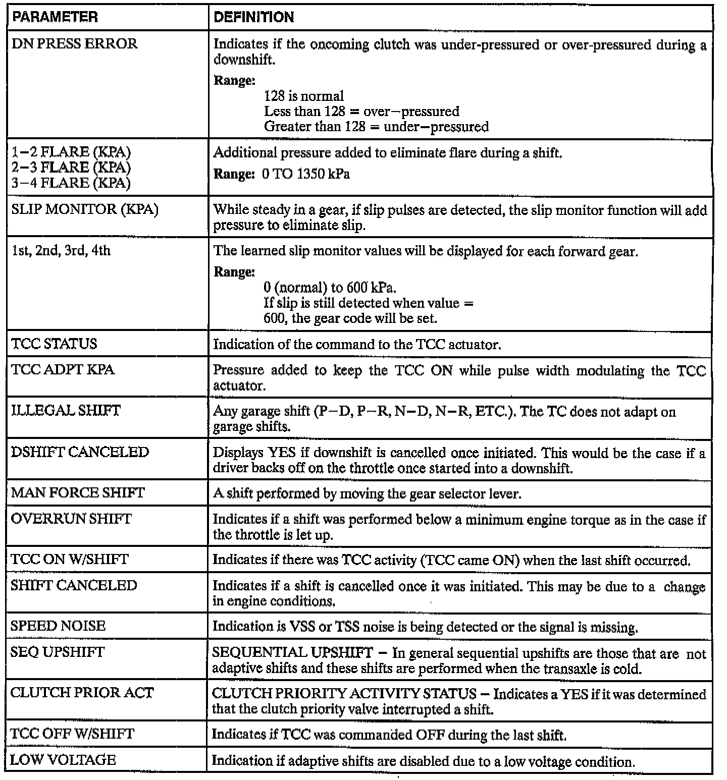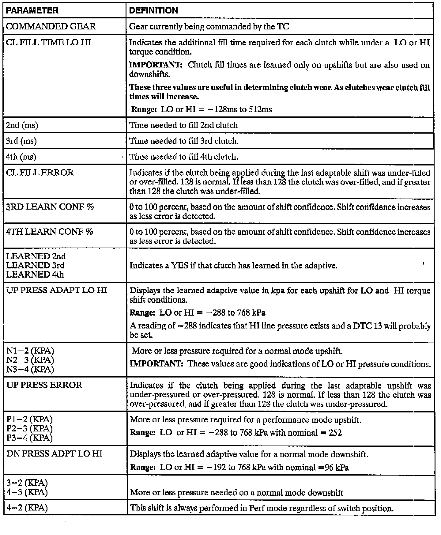 The following will either display conditions when the adaptive parameters are not being updated, or the values currently stored in adaptive memory.