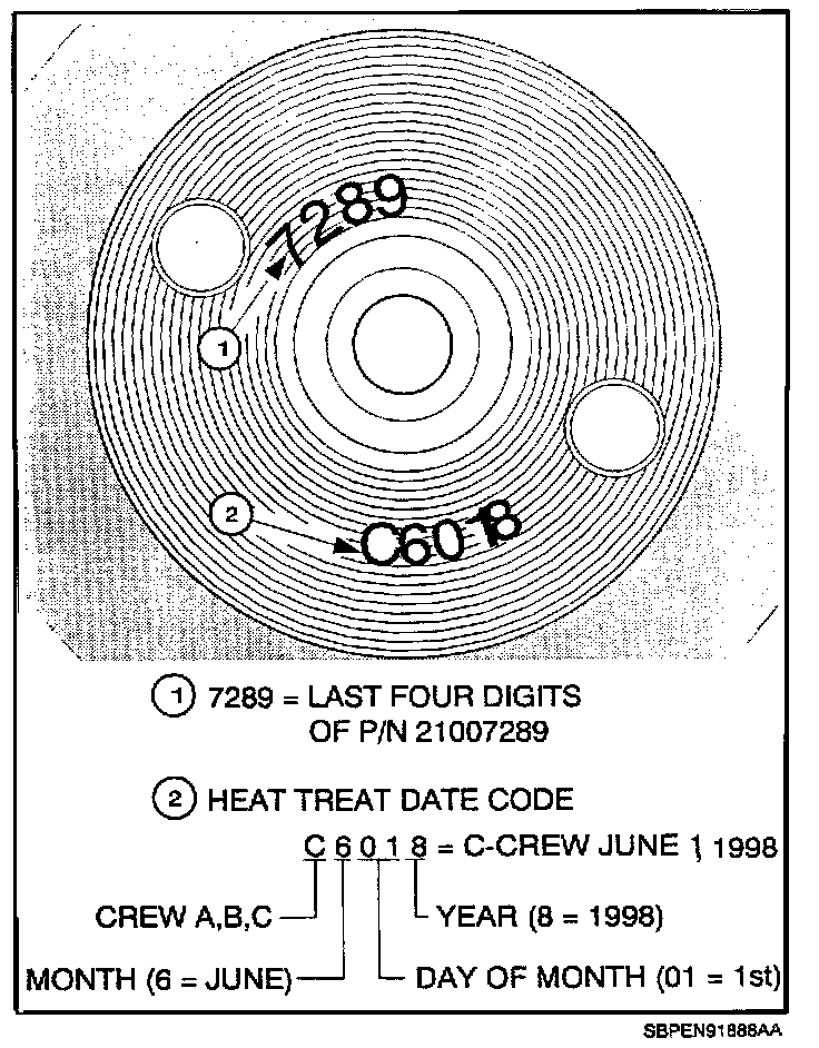 ^ If the four digits "7289" (last four digits of P/N 21007289) are stamped into the end of the camshaft and/or the heat treat date is on or after June 1, 1998 (A/B/C 6018) proceed to next step.