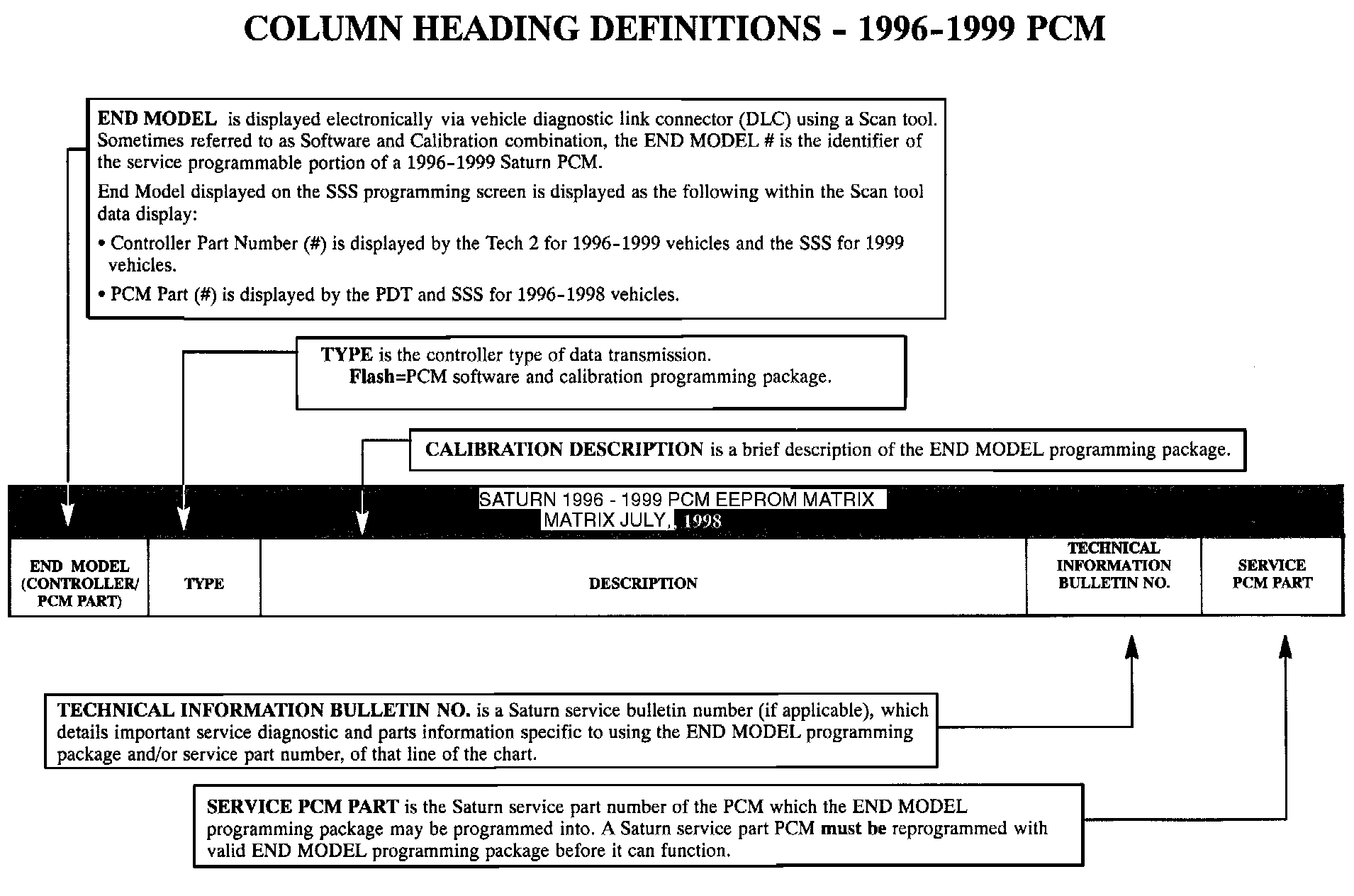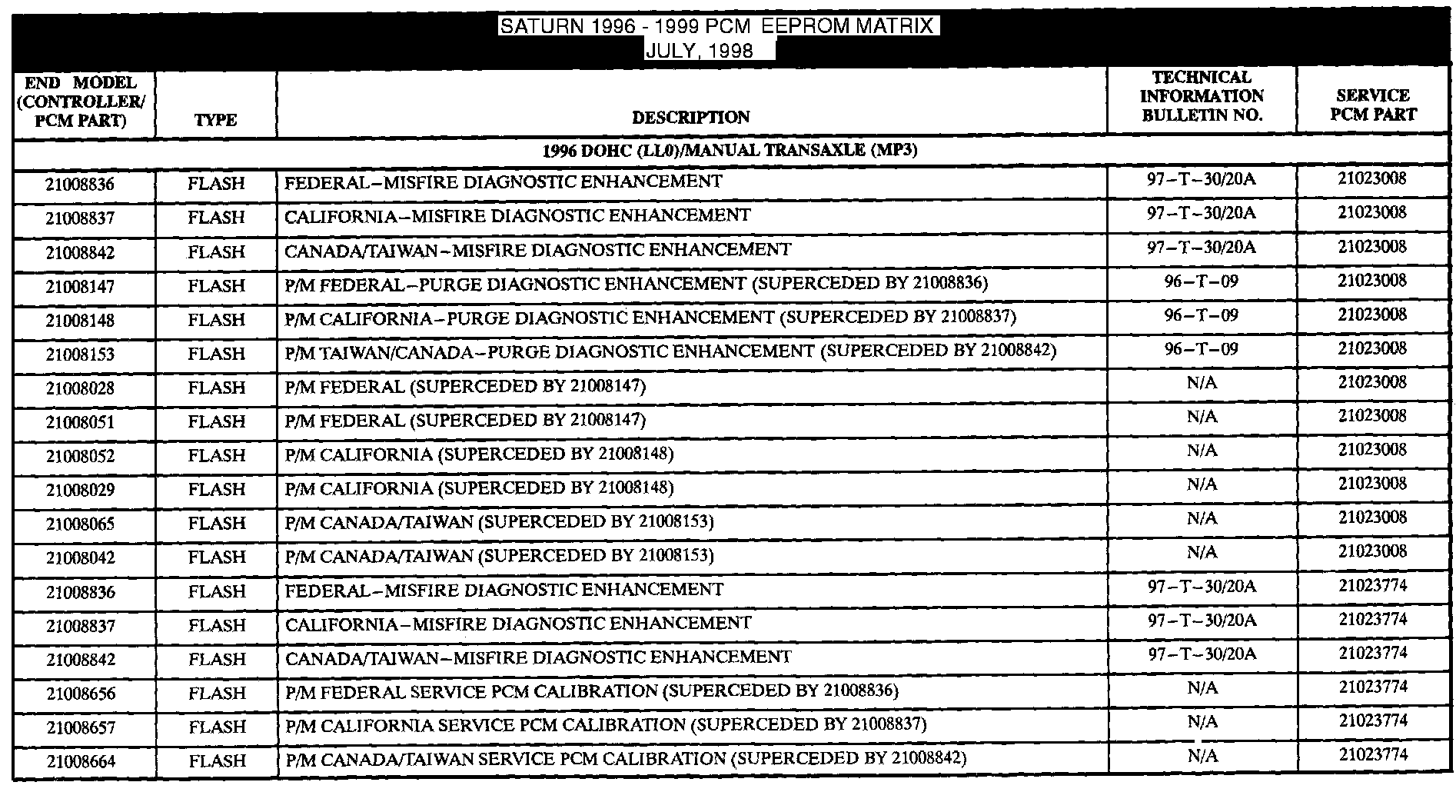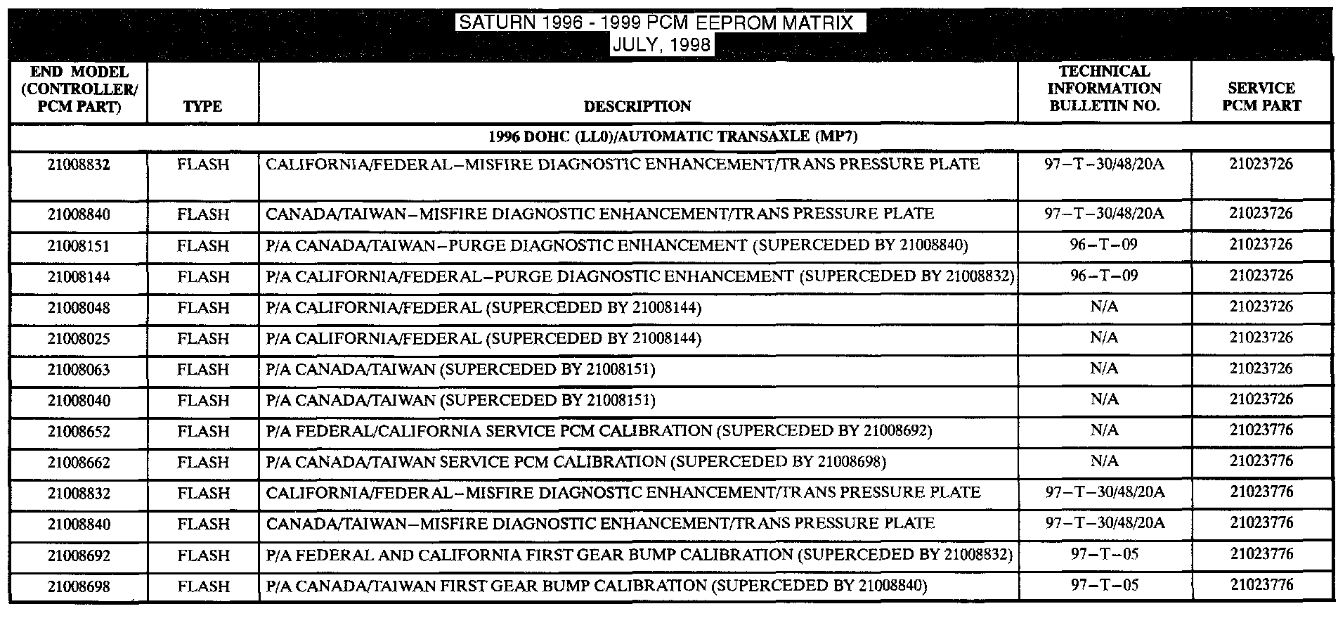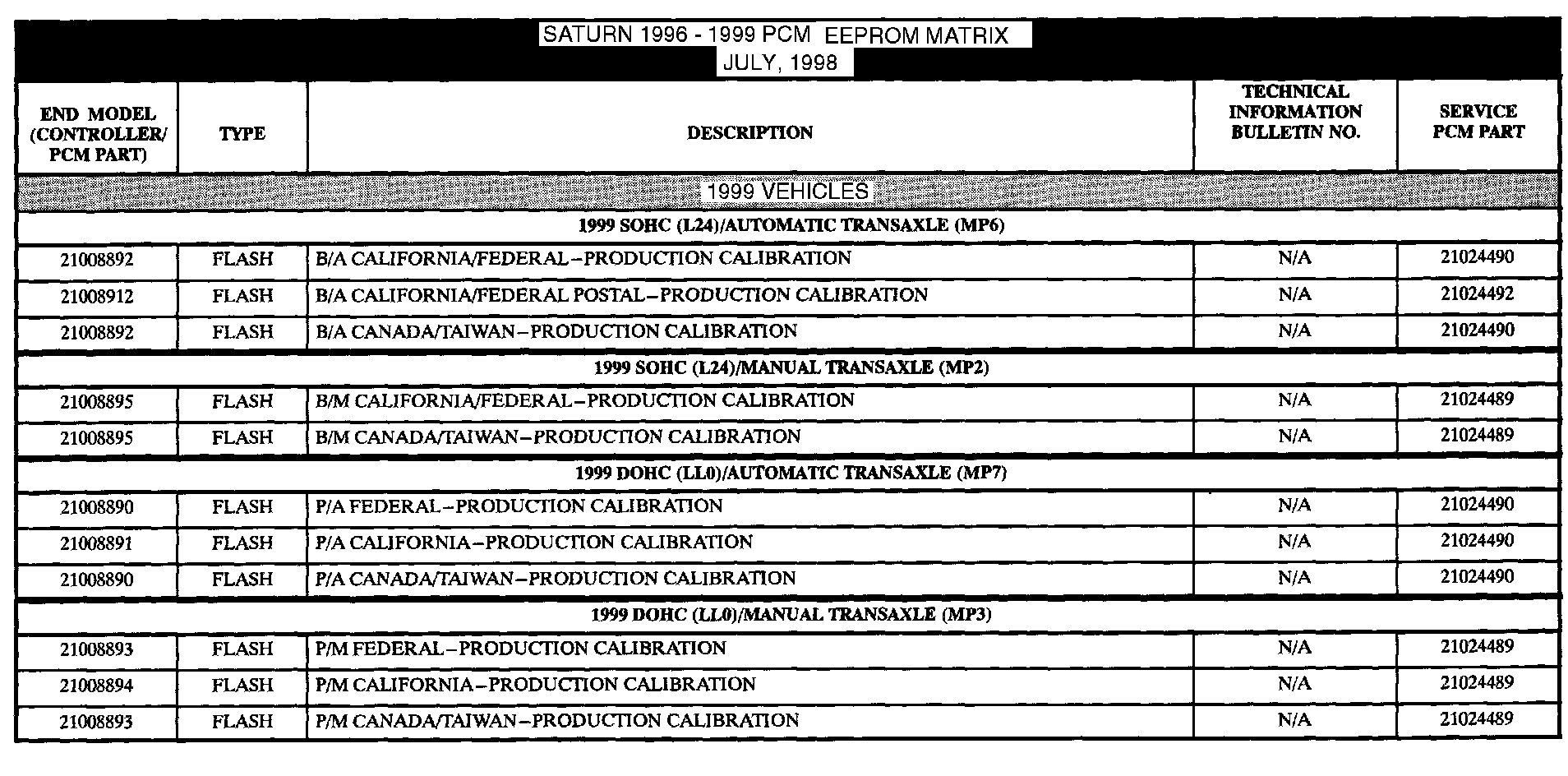 The charts summarize 1991-1999 Saturn powertrain control module (PCM) engine, transaxle and antilock brake controller electrically erasable/programmable read-only memory (EEPROM) calibrations released to date.