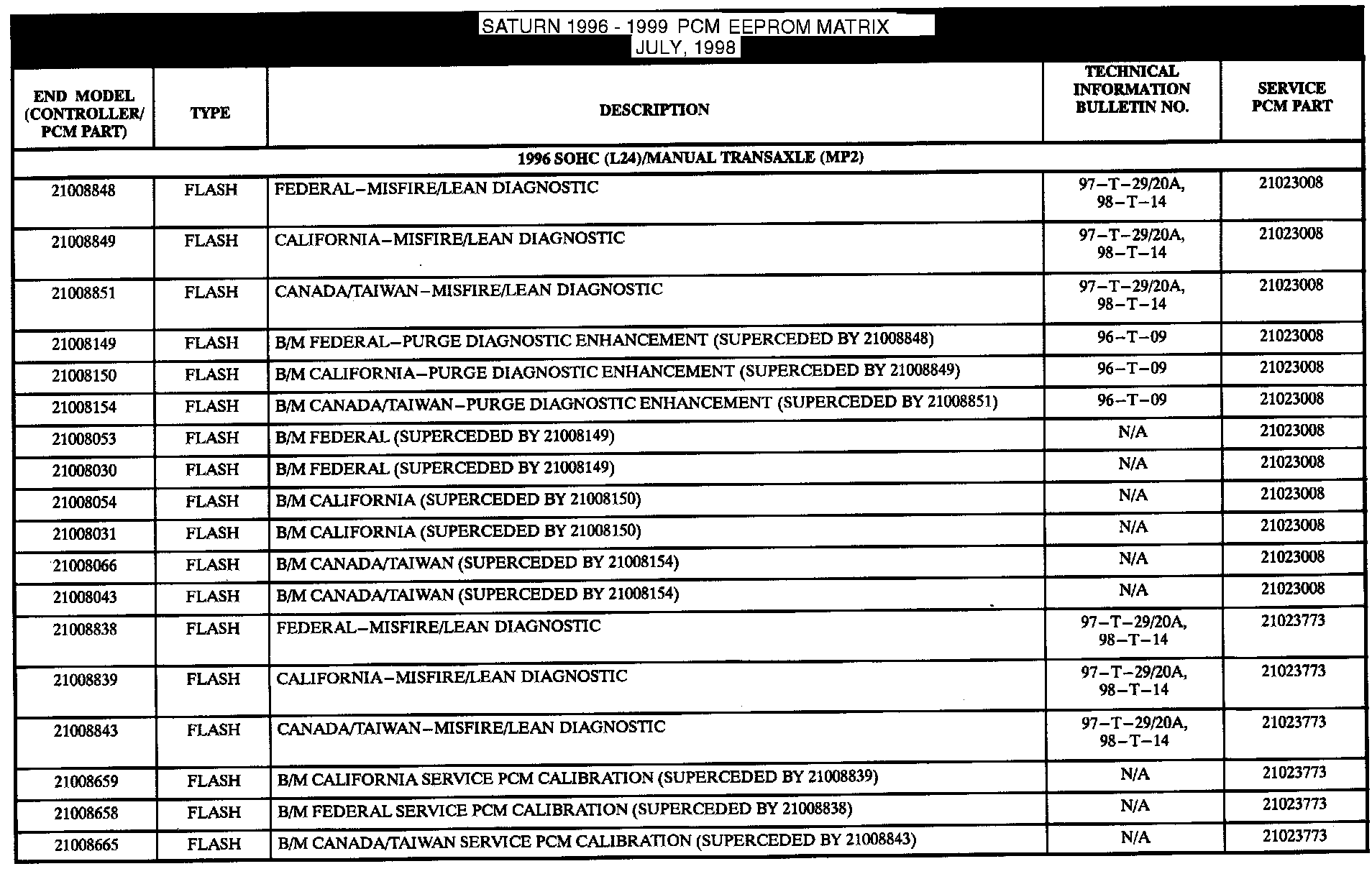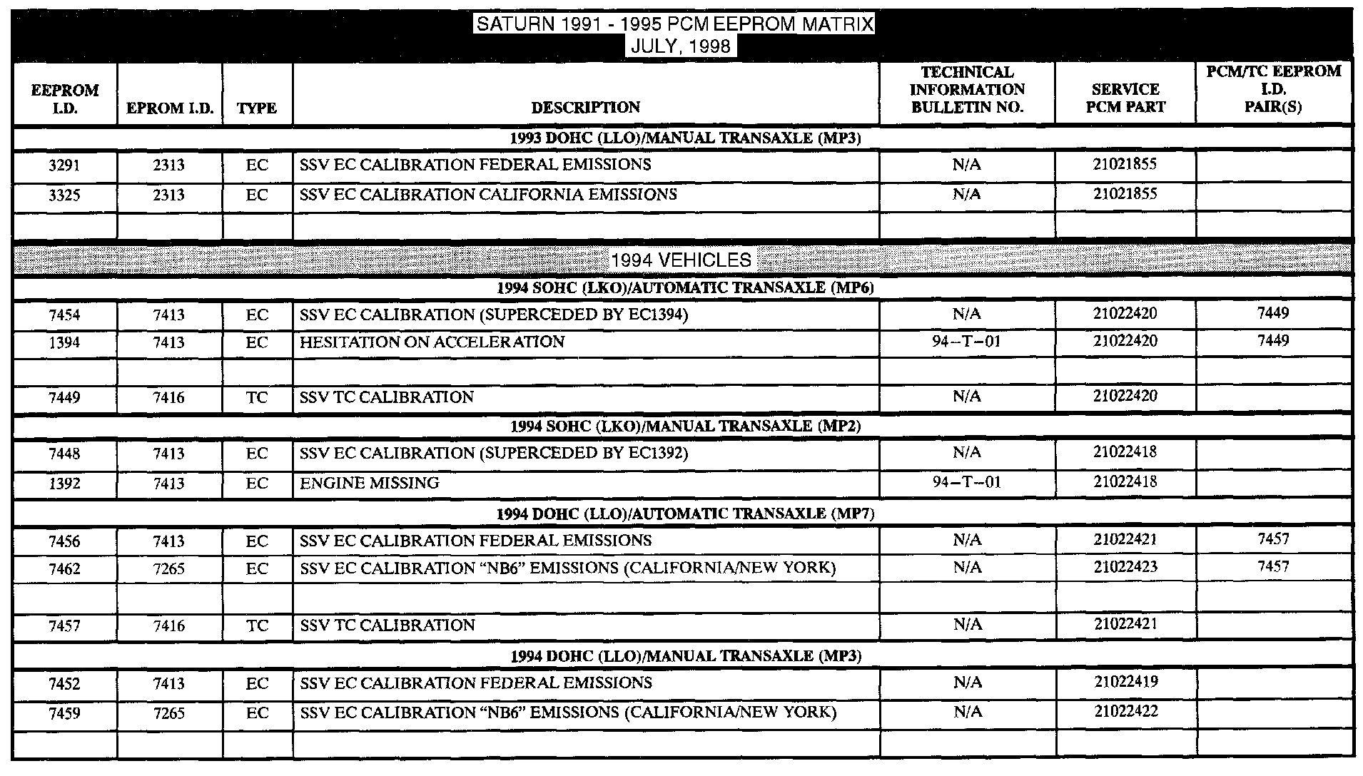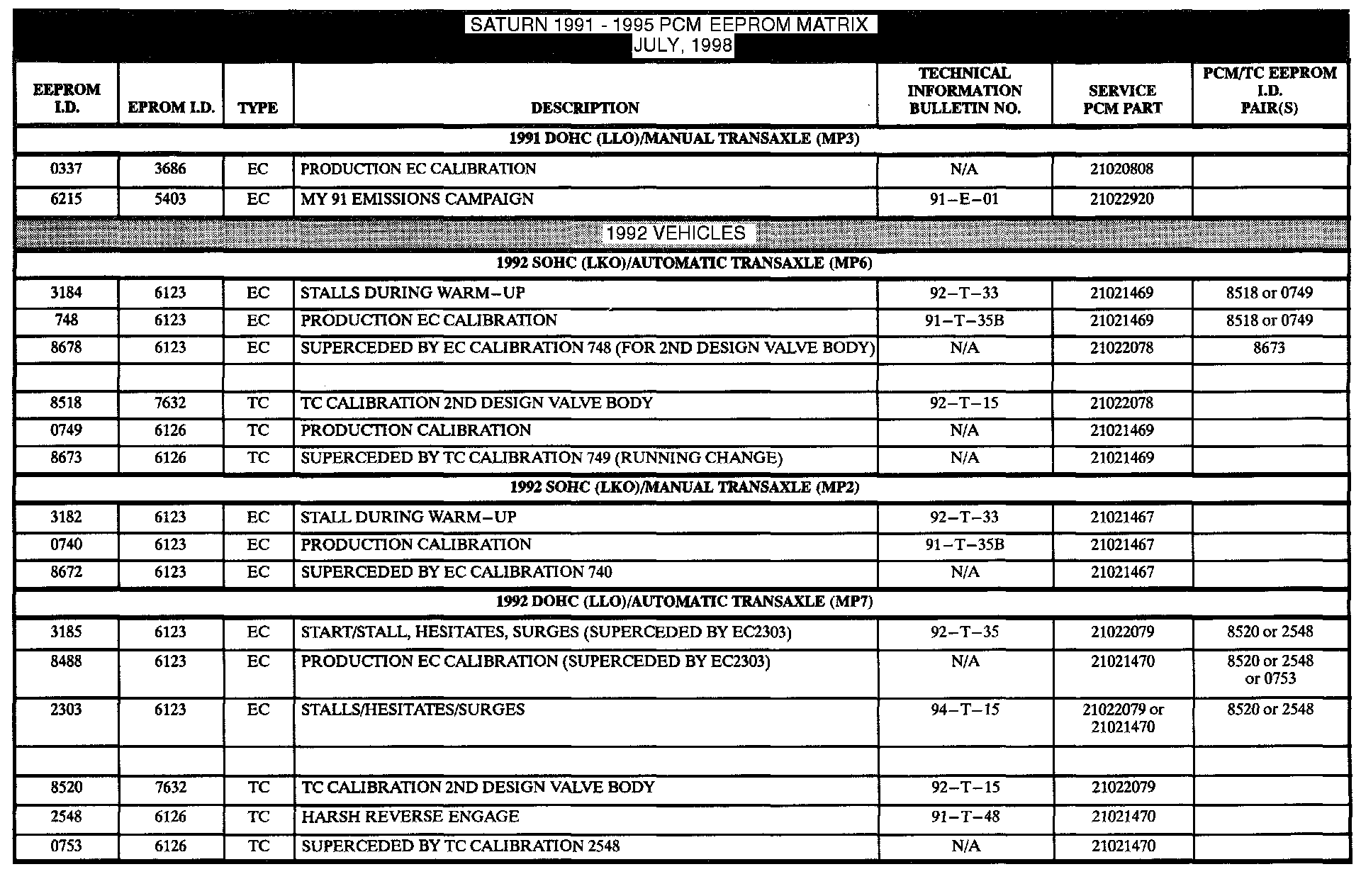When any diagnosis leads to EEPROM calibration, the Saturn Service Stall System (SSS) EEPROM reprogramming feature will provide a list of valid EEPROM calibrations for the vehicle and allow you to select the appropriate one for reprogramming. The EEPROM calibrations listed on the charts may vary from the (SSS) selections if updates are made by satellite or CD-ROM prior to updating this bulletin.