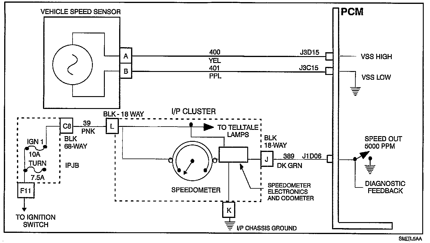 The speedometer/odometer is controlled by electronics within the instrument panel cluster and by the vehicle speed signal (5000 pulses per mile) provided by the PCM. This signal is based on the raw vehicle speed signal that the PCM receives from the vehicle speed sensor (VSS), and the tire size information programmed into the PCM.