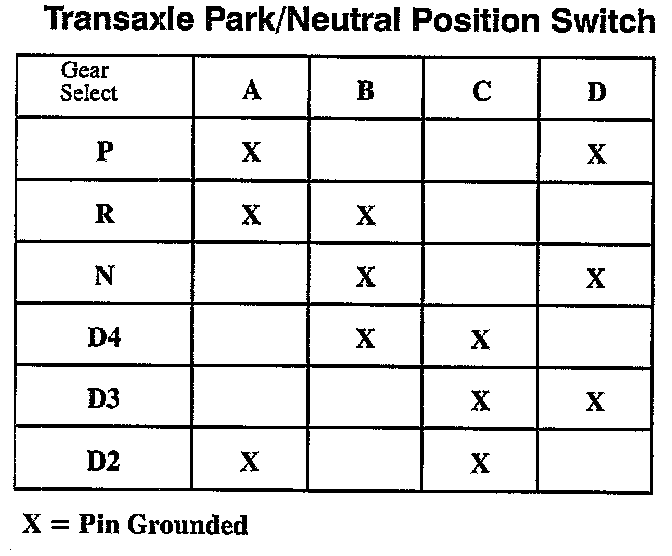 The park/neutral position switch contains four switches that ground four different circuits. These circuits are 771 (switch A), 772 (switch B), 773 (switch C) and 776 (switch D). (The switch also contains the backup lamp switch and the neutral/start switch.)