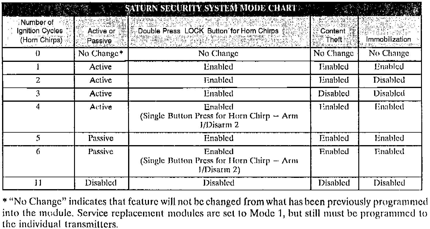 The following information is for 1997 production vehicles equipped with factory installed RKE/SSS or 1991-1997 vehicles with Retailer installed Sautrn security systems. The Saturn security system can be programmed to any of the following modes; however, unless otherwise requested by the customer, the Saturn security system should be programmed to mode 1. If the customer requests the passive arming feature to be enabled, use mode 5.