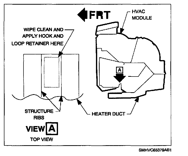 7. Peel backing off of hook side of hook and loop retainer and apply to top center of heater duct between two structure ribs. Press firmly to seat.