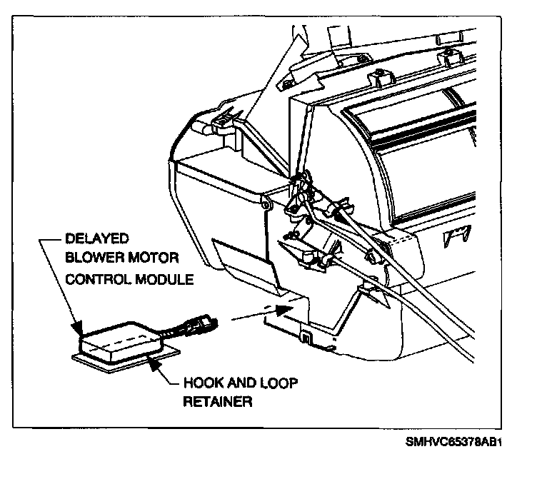 6. Remove hook side of hook and loop retainer that is attached to delayed blower motor control module.