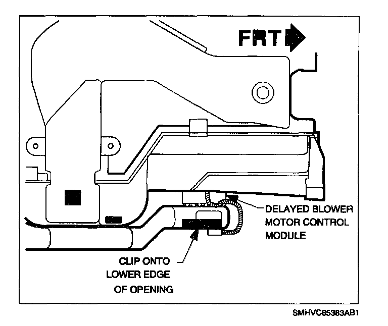 11.2 Attach delayed blower motor control module pigtail harness connector to the lower forward edge of the heater duct. Place clip as far forward as possible.