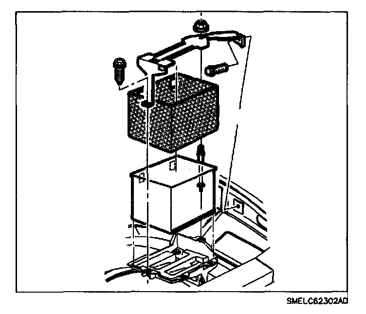 26. Remove the battery hold-down retaining nut and screw, and lift off bracket assembly.