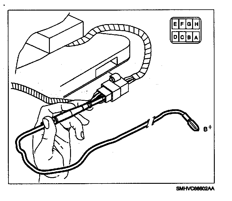 2. Start engine and turn On A/C and verify that compressor clutch engages. With clutch engaged, apply battery voltage to the test adapter installed in step 1 above.