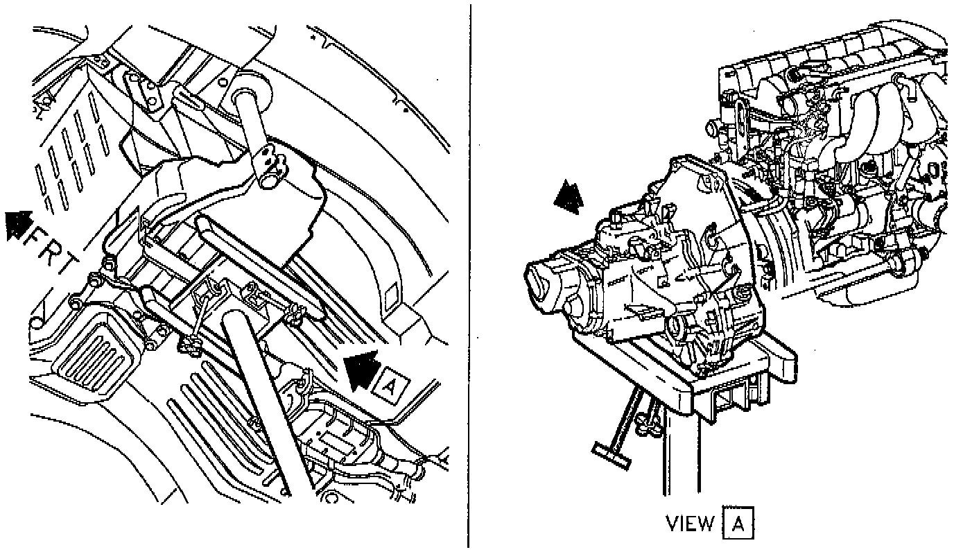 3. Raise transaxle into vehicle to align input shaft to the center of the clutch. Guide transaxle into position, rotate back and forth to align input shaft splines to clutch disc.