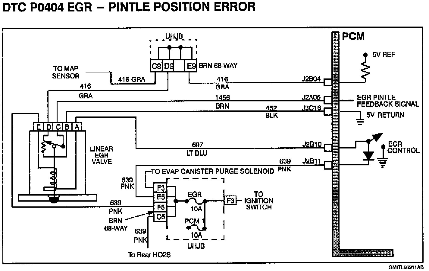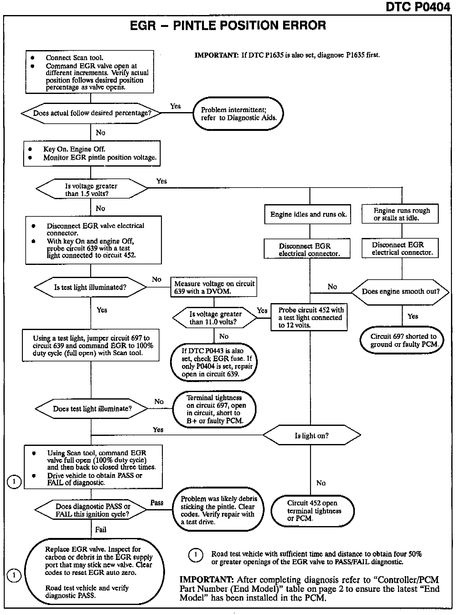 The linear EGR system consists of a linear EGR valve, the PCM and its associated wiring. The EGR valve solenoid is controlled directly by the PCM when certain conditions have been met. The PCM contains a diode feedback circuit which dissipates energy when the valve is cycled Off. When the PCM grounds the valve, the diagnostic feedback signal can determine if the valve had actually moved. DTC P0404 has been defined to monitor the feedback signal. This diagnostic will determine if the position feedback signal properly falls within the correct range under different valve operating conditions.