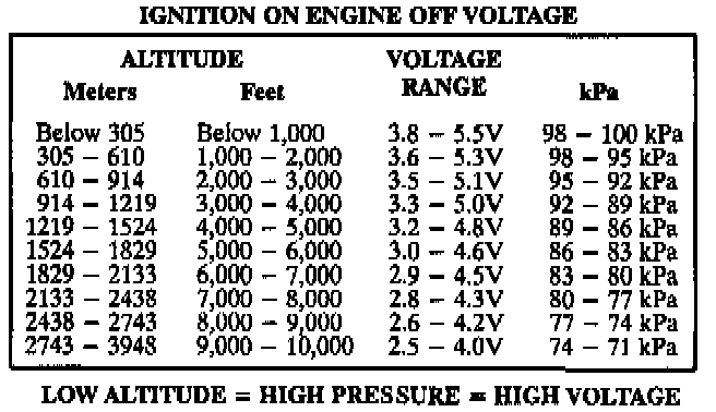 With the engine Off and key On, the map reading should be the same as the barometric reading because manifold pressure is equal to atmospheric pressure (no vacuum - high voltage). Comparing this reading to a known good vehicle with the same sensor is a good way to check accuracy of a suspect sensor. Readings should be within 0.4 volts