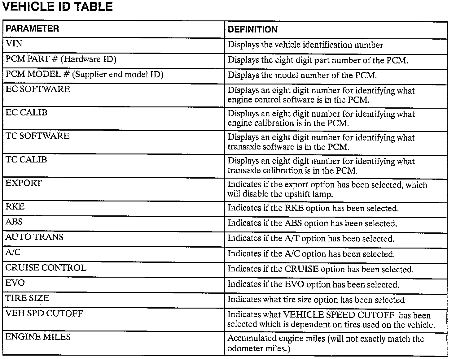 Vehicle ID Table: