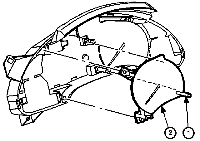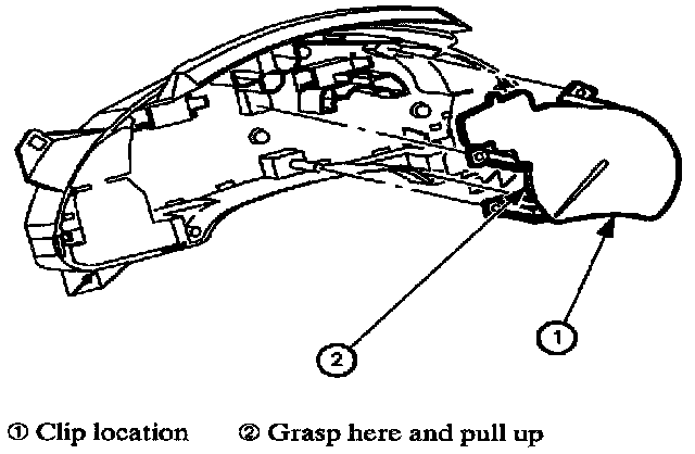 12. With end of housing (white portion of cluster) in one hand and lens/mask assembly (black portion of cluster) in other hand, disengage clip #1 with one hand while separating lens/mask assembly from housing with other hand.