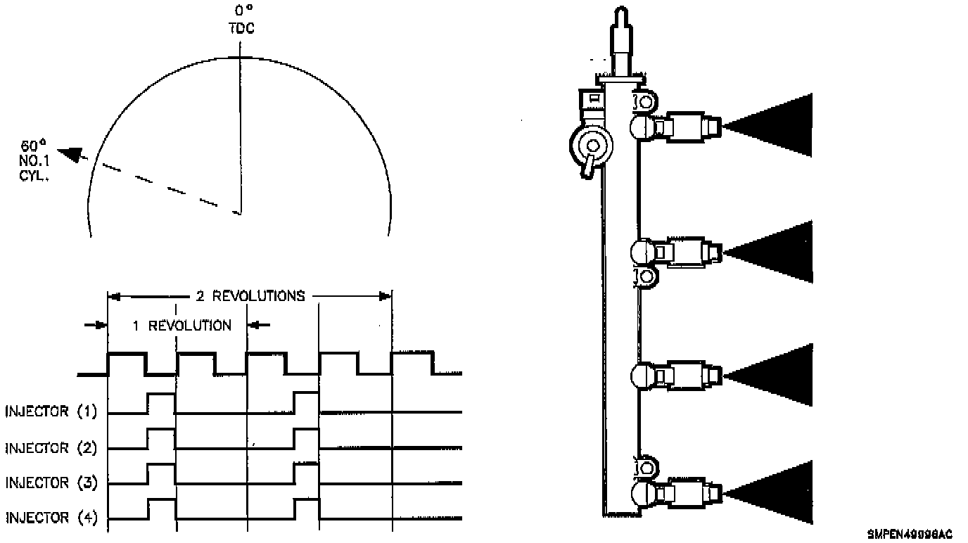 Fuel injector pulses are synchronized with the ignition reference (2X) pulse to the PCM. All fuel injectors are pulsed once each time that the number one cylinder is 60 degrees before top dead center (BTDC).