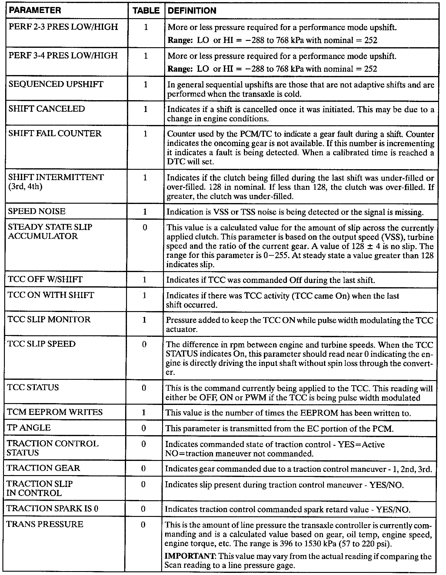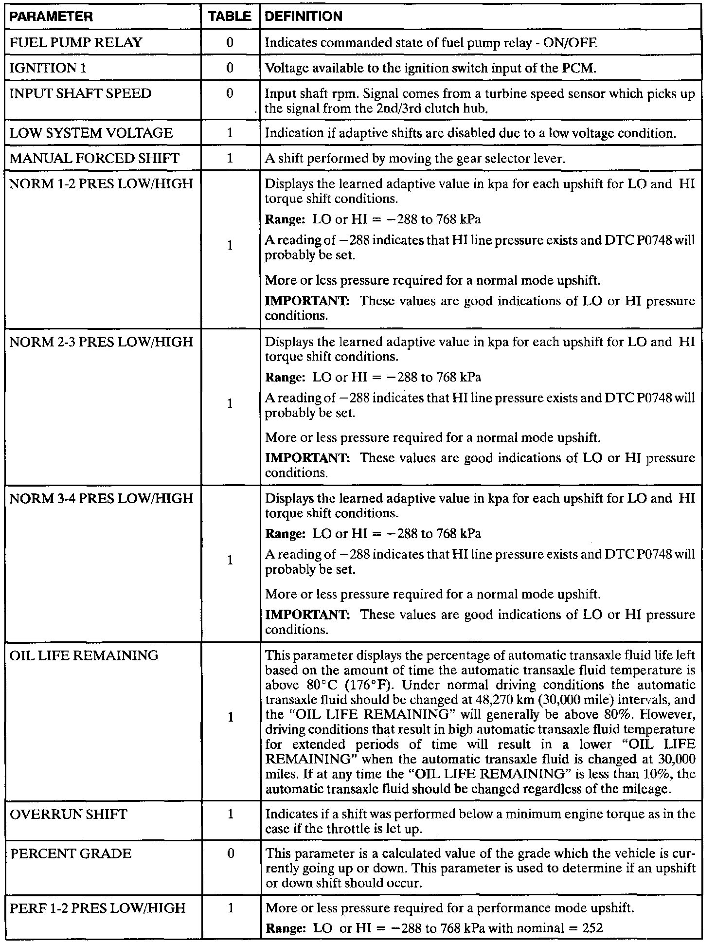 The following data definitions are intended to assist in understanding the data displayed by a Scan tool when it is communicating with the Powertrain Control Module. A thorough understanding of this data will not only aid in diagnosing transaxle related problems, but will also help eliminate unnecessary repairs.The scan tool displays data in several different "tables". Data from a single component is some times displayed in multiple tables. Here is an index for the available tables followed by the actual scan tool data definitions: