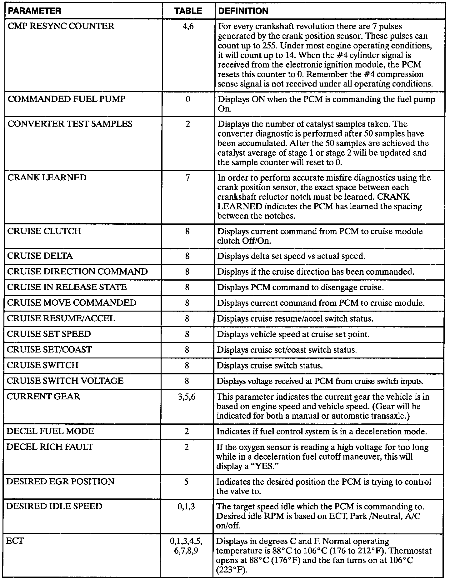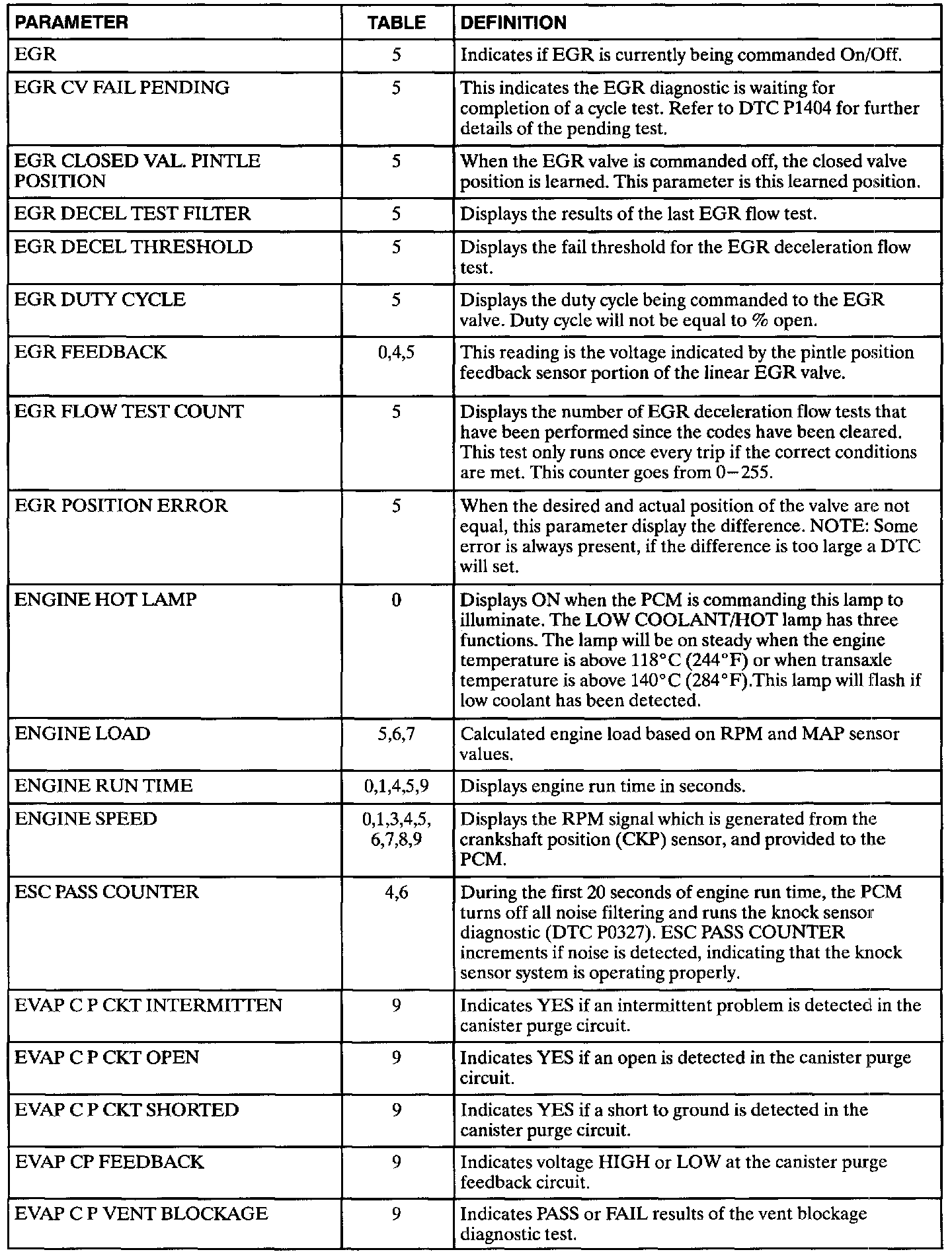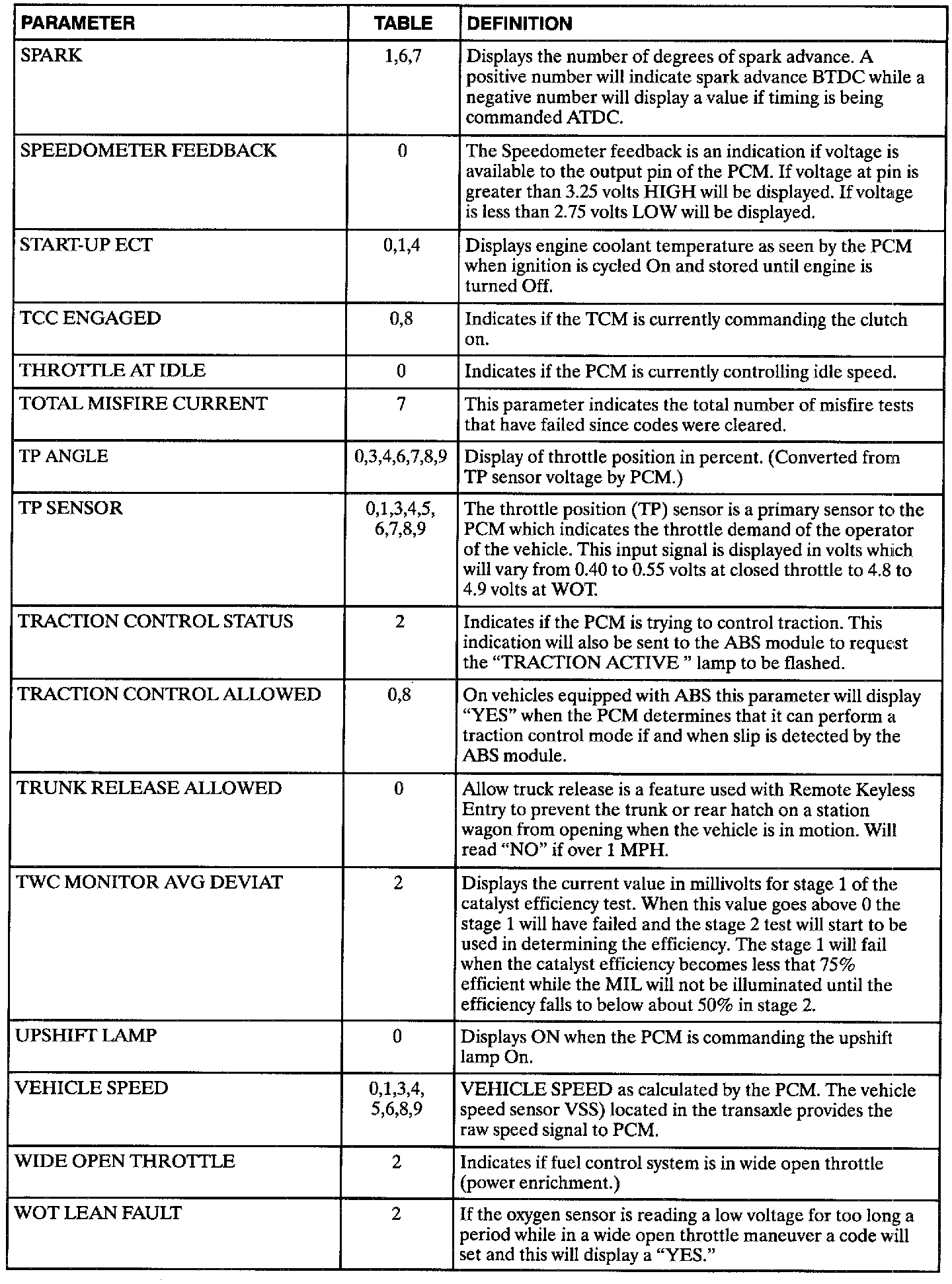 The following data definitions are intended to assist in understanding the data displayed by a Scan tool when it is communicating with the Powertrain Control Module. A thorough understanding of this data will not only aid in diagnosing transaxle related problems, but will also help eliminate unnecessary repairs.The scan tool displays data in several different "tables". Data from a single component is some times displayed in multiple tables. Here is an index for the available tables followed by the actual scan tool data definitions: