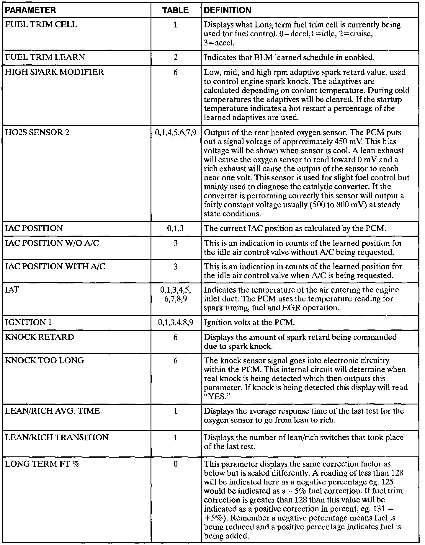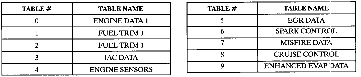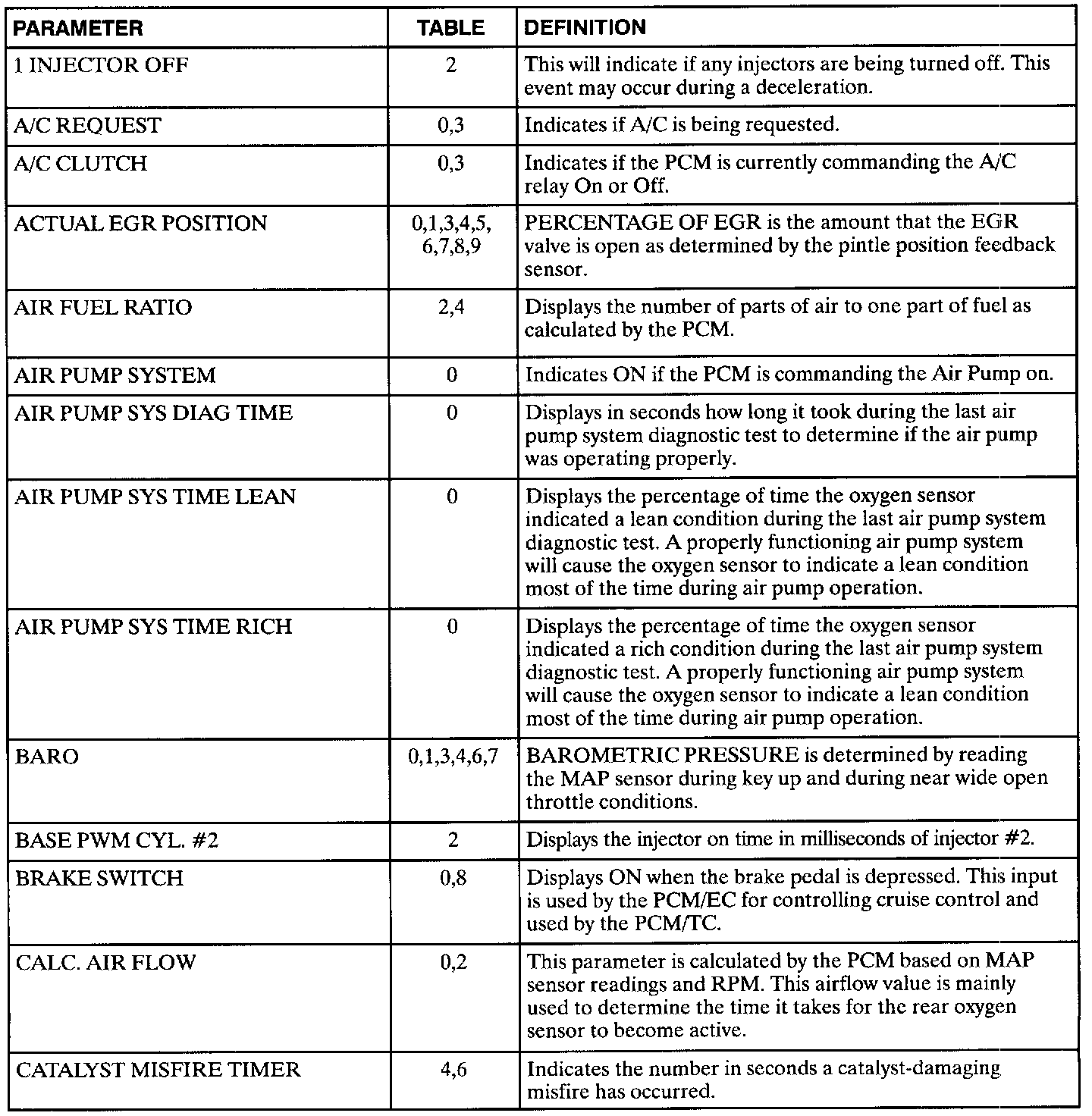 The following data definitions are intended to assist in understanding the data displayed by a Scan tool when it is communicating with the Powertrain Control Module. A thorough understanding of this data will not only aid in diagnosing transaxle related problems, but will also help eliminate unnecessary repairs.The scan tool displays data in several different "tables". Data from a single component is some times displayed in multiple tables. Here is an index for the available tables followed by the actual scan tool data definitions: