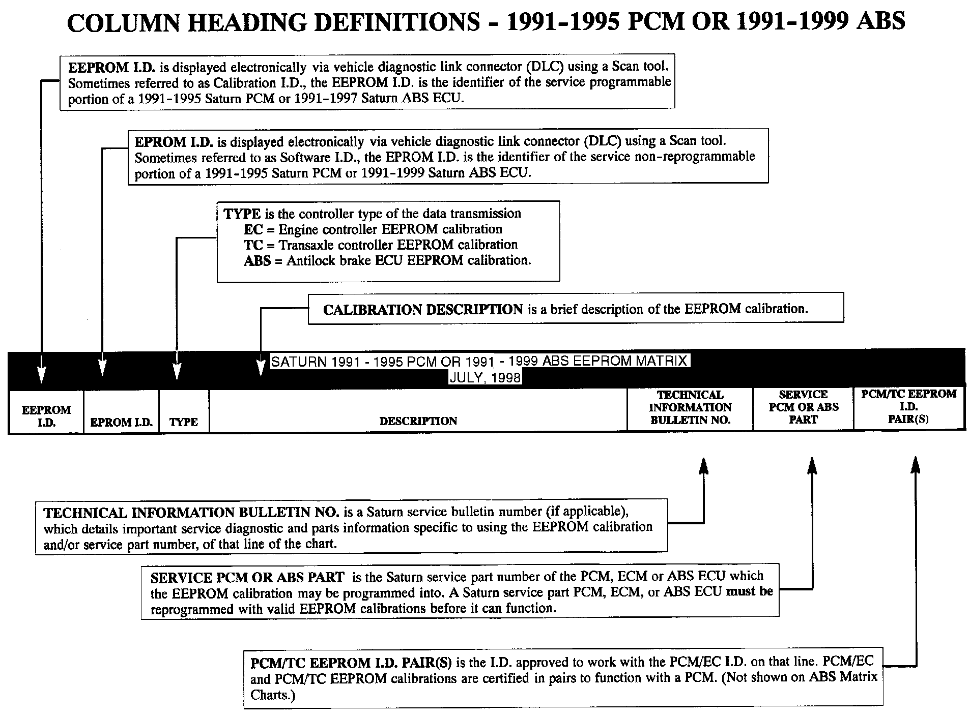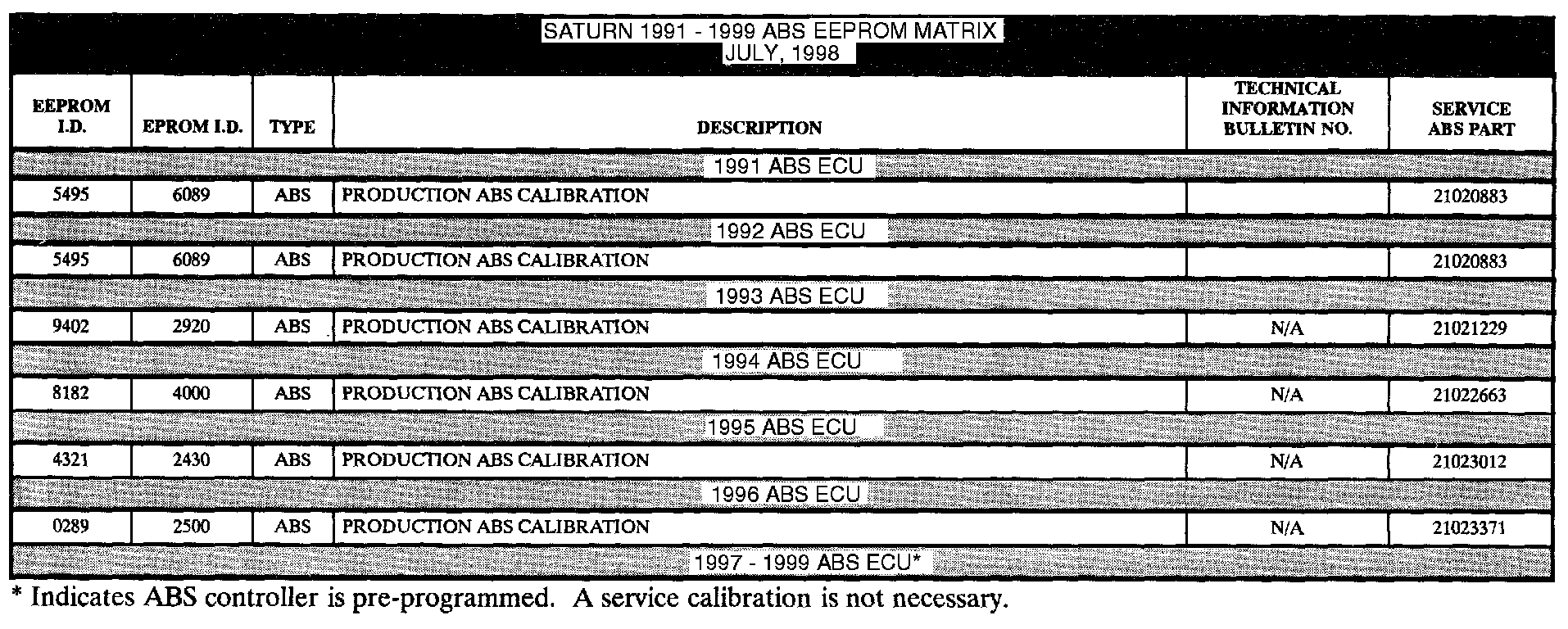 The charts summarize 1991-1999 Saturn powertrain control module (PCM) engine, transaxle and antilock brake controller electrically erasable/programmable read-only memory (EEPROM) calibrations released to date.