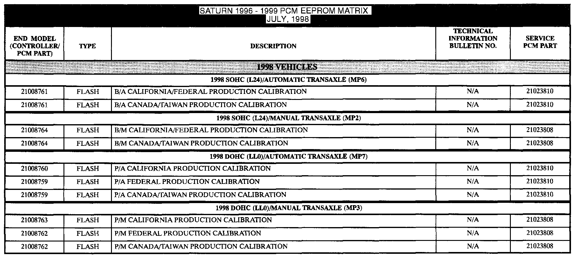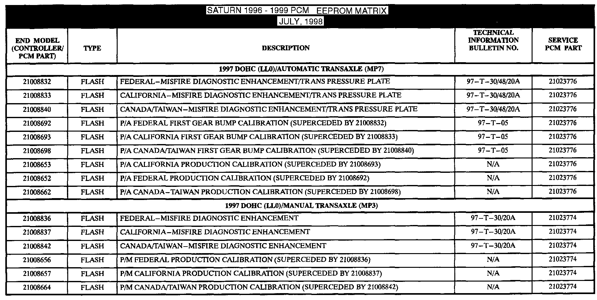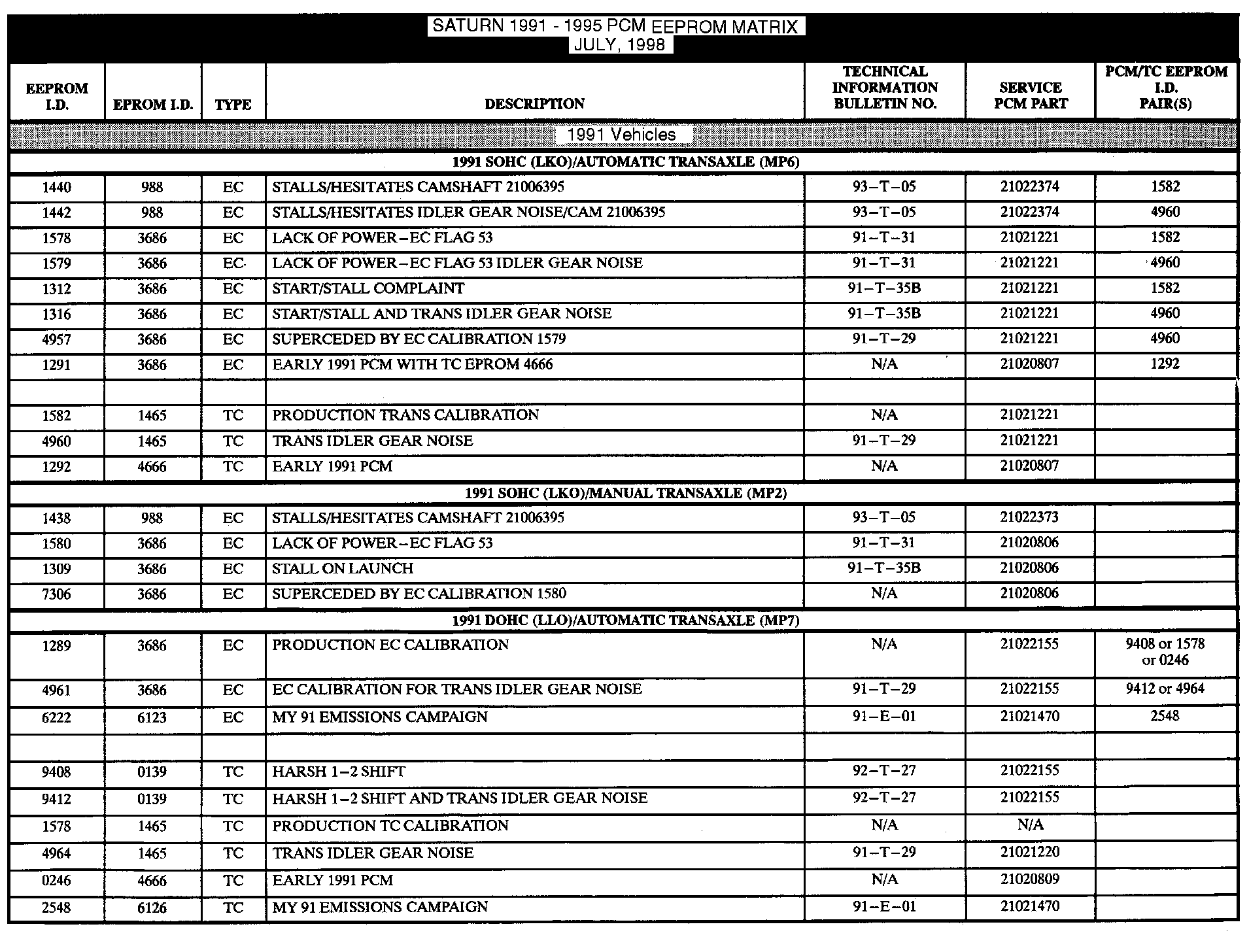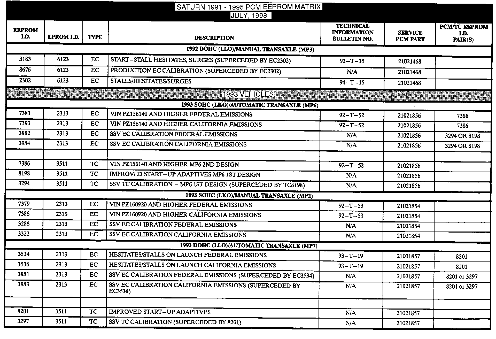 When any diagnosis leads to EEPROM calibration, the Saturn Service Stall System (SSS) EEPROM reprogramming feature will provide a list of valid EEPROM calibrations for the vehicle and allow you to select the appropriate one for reprogramming. The EEPROM calibrations listed on the charts may vary from the (SSS) selections if updates are made by satellite or CD-ROM prior to updating this bulletin.