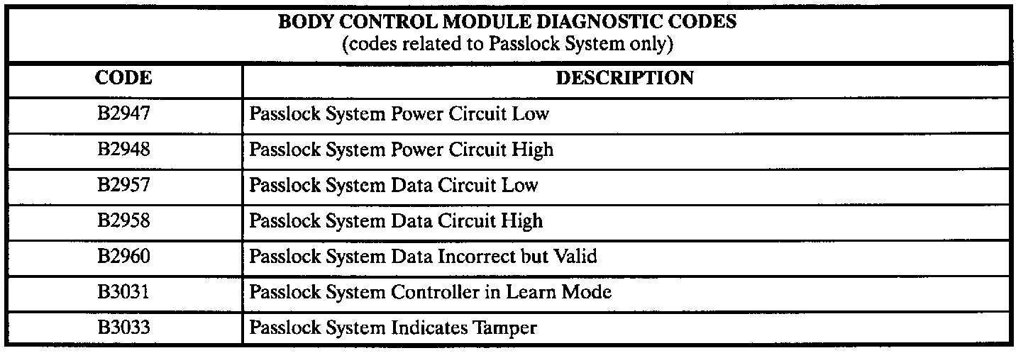 The table lists the body control module (BCM) diagnostic codes related to the Passlock system: