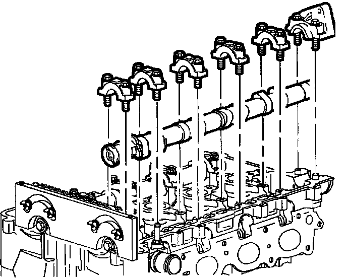 The L61 engine camshafts, rocker arms, lash adjustments, valve springs, and seals can be serviced without removing the exhaust system, vibration damper, front mount, or front cover. The following procedure must be followed to prevent damage to the camshafts, lash adjusters, cylinder head, and lower timing chain guides.
