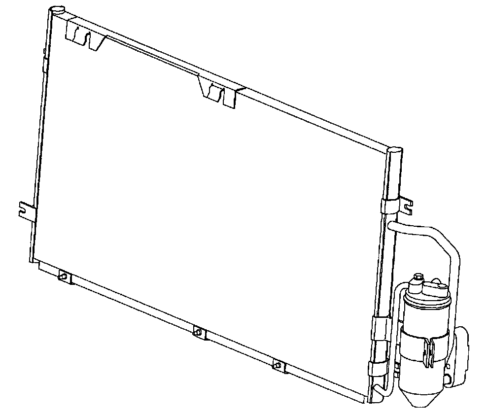 The condenser is located forward of and is mounted to the radiator. The condenser design is similar to that of a radiator with a multiple tube cross flow pattern. The condenser transfers heat from the high temperature refrigerant gas to the air, causing the refrigerant to condense into a liquid. This condensed refrigerant then flows out to the receiver/dehydrator assembly. The cooling capacity of the condenser will be diminished if the condenser fins are not kept clean and straight.