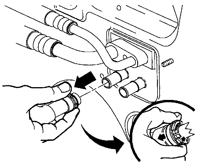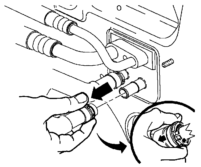 13. Remove heater inlet hose from heater core pipe by depressing quick connect collar tab, located at 6:00, and pulling black collar towards front of vehicle and then pulling quick connect off of heater core pipe.
