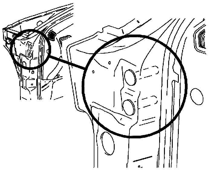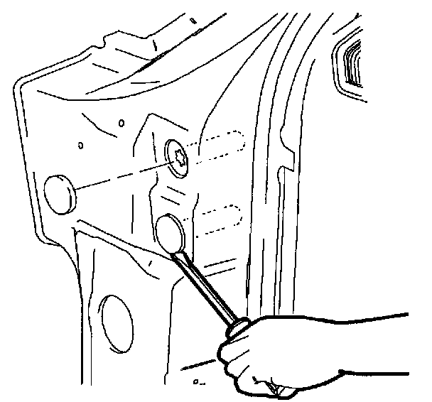 87. Install cockpit assembly aid (J 43894) into A-pillar beam bolt holes. Tool flange should fit tight to A-pillar surface when completely installed. This tool is needed to prevent accidentally dropping bolt inside A-pillar.
