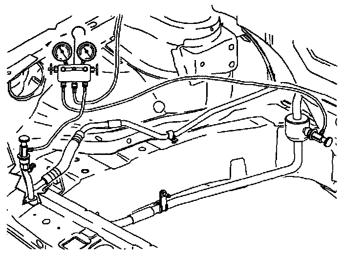 4. Connect high pressure (red) gauge hose to discharge service port located on the liquid line forward of air box. Pull valve assembly collar up, place valve assembly over service port and release collar.