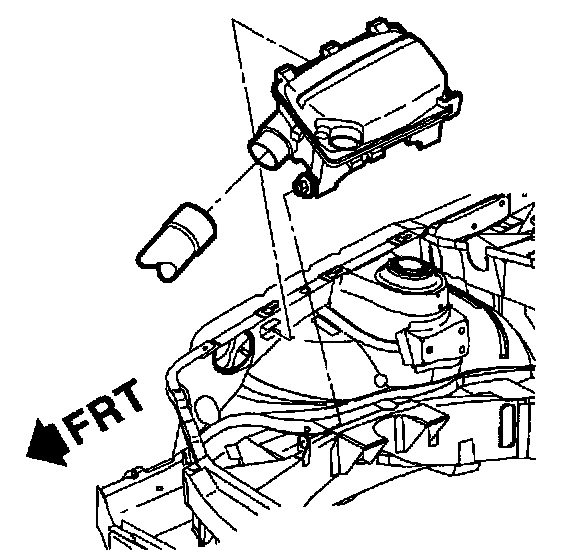 1. Install air box. Ensure that lower pin engages into rubber mount grommet and that lower duct fits into resonator outlet.