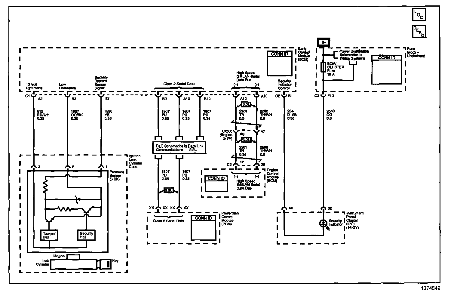 The Passlock(TM) system is provided in order to prevent vehicle theft if the ignition lock cylinder is forced to rotate or the ignition switch is operated while separated from the ignition lock cylinder case. The BCM provides security system sensor power and low reference for the Passlock(TM) sensor. The BCM also measures the security system sensor voltage. When the correct key is used to start the vehicle, a magnet on the lock cylinder passes close to the Passlock(TM) sensor within the ignition lock cylinder case. The magnet activates the security hall effect sensor in the Passlock(TM) sensor which completes a circuit from the security sensor signal circuit through a resistor to the security sensor low reference circuit. The resistance value will vary from vehicle to vehicle. The BCM will measure the voltage on the security sensor signal circuit and compare this voltage to a previously learned voltage. If the voltage measured is within the valid range, the BCM will send a class 2 message to the powertrain control module (PCM) to enable vehicle starting. If the voltage measured is not within the valid range, a class 2 message will be sent to the PCM to disable starting of the vehicle.