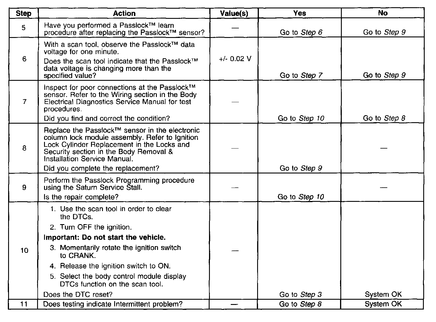 ^ Inspect for poor connections at the Passlock(TM) sensor. Refer to Testing for Intermittent and Poor Connections in Wiring Systems in the appropriate Saturn L-Series Service Manual.