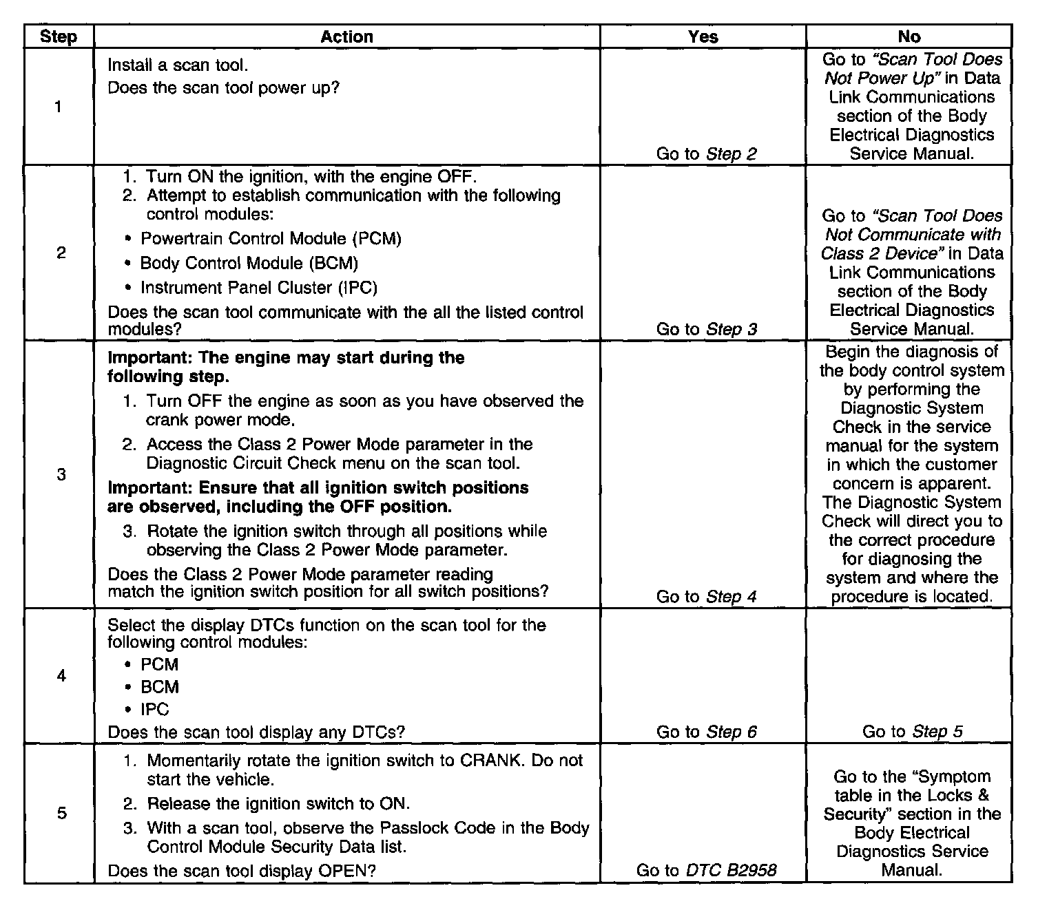 2. Lack of communication may be due to a partial malfunction of the class 2 serial data circuit or due to a total malfunction of the class 2 serial data circuit. The specified procedure will determine the particular condition.