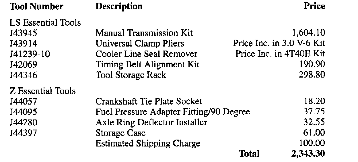 During the week of May 24, 1999, Kent-Moore will be shipping the final shipment of LS essential tools, second LS storage rack and the 2000 MY Z car essential tools to all open Saturn retail service facilities. The illustration is a description of what is being sent to you, along with the associated cost for each tool, the storage rack and shipping.